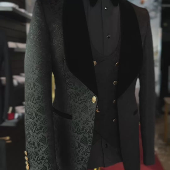 A masterpiece of modern elegance, this Luxurious black tuxedo features a 1-inch velvet trim on the trousers and a luxurious floral-textured fabric that adds depth and character to the ensemble.