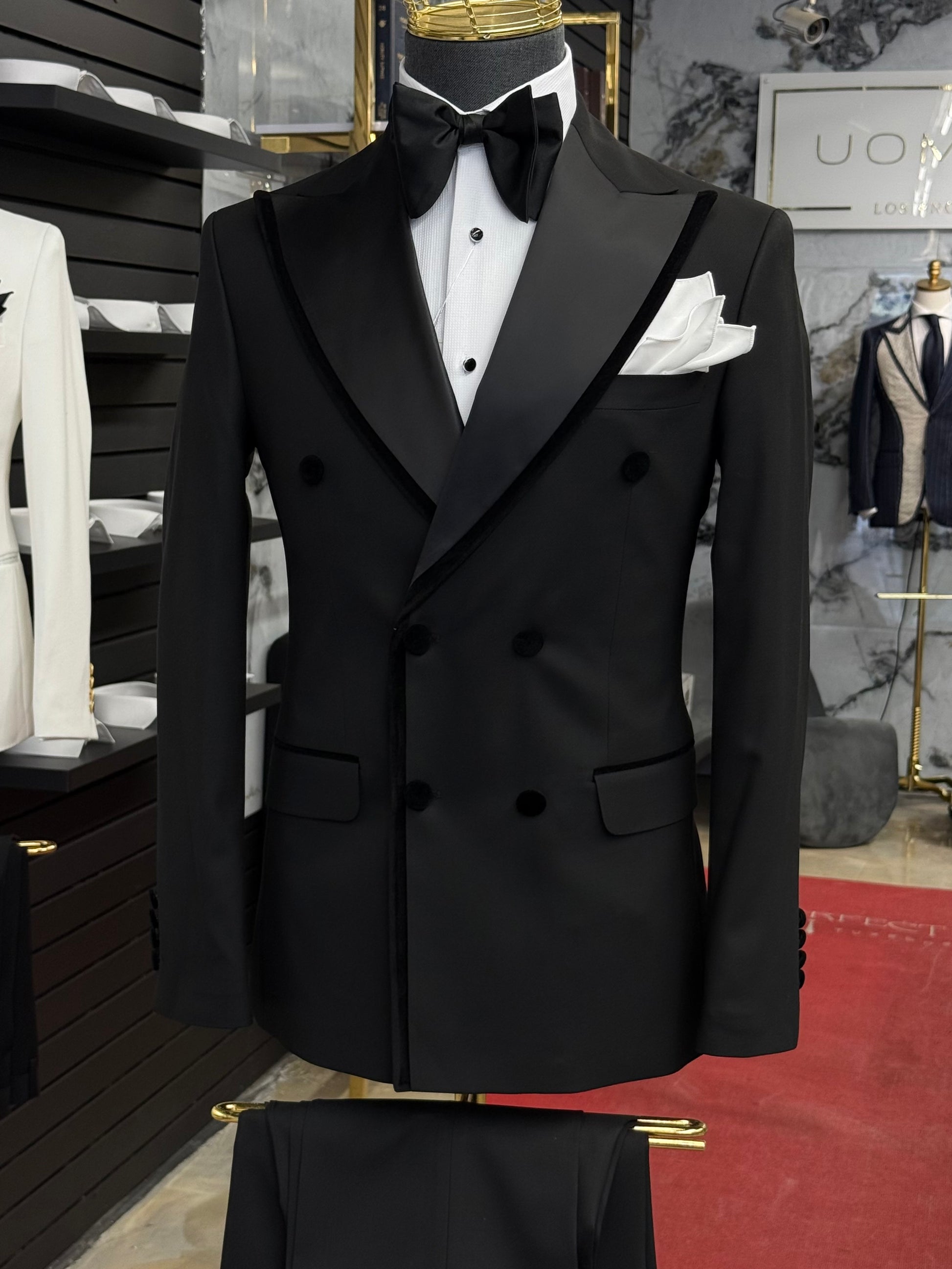 Finished with classic black-tie details—including a crisp white tuxedo shirt, bow tie, and tailored trousers—this piece reflects the essence of European formalwear: elegant, confident, and enduring.
