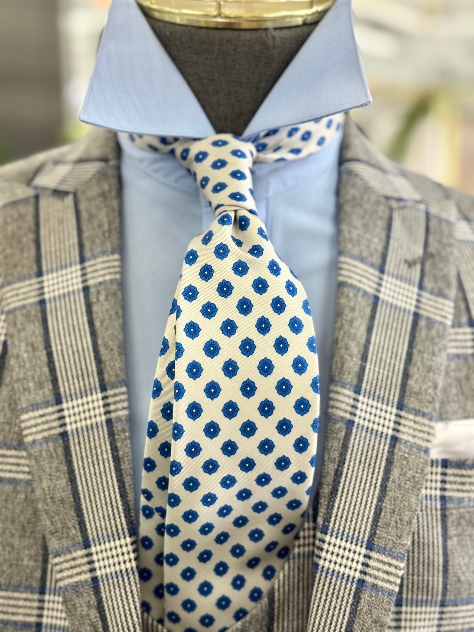 Clean, elegant, and effortlessly refined, this white and blue patterned tie is designed for those who appreciate timeless style with a modern edge. The crisp white base is enhanced with subtle blue geometric detailing, creating a fresh and sophisticated look ideal for both formal and smart business attire.