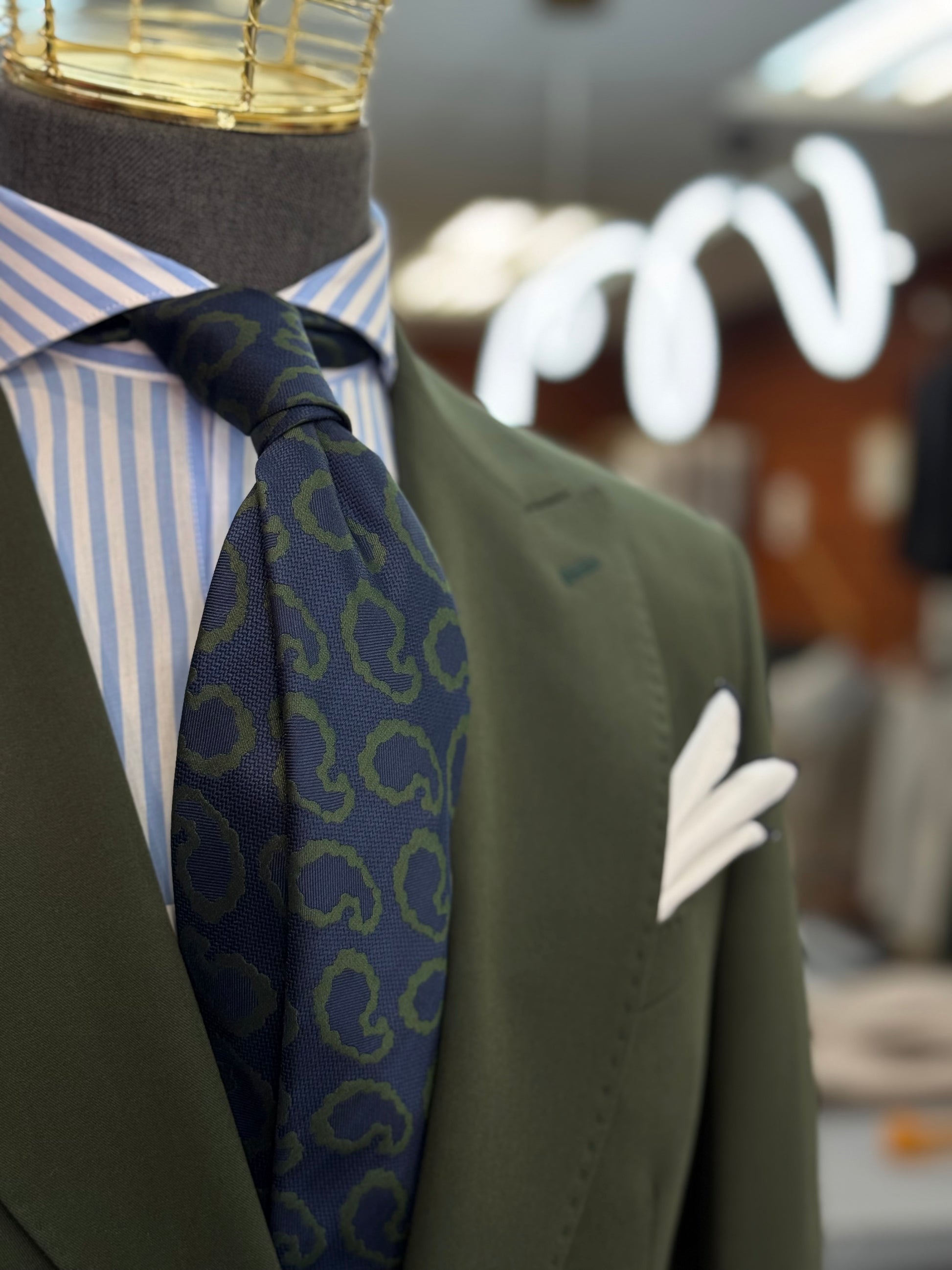 The matte finish of the weave gives it depth, while the pattern provides texture and intrigue without being overwhelming. It pairs beautifully with striped shirts (as shown) and solid suits in earthy or neutral tones—olive, brown, charcoal, or even midnight blue.