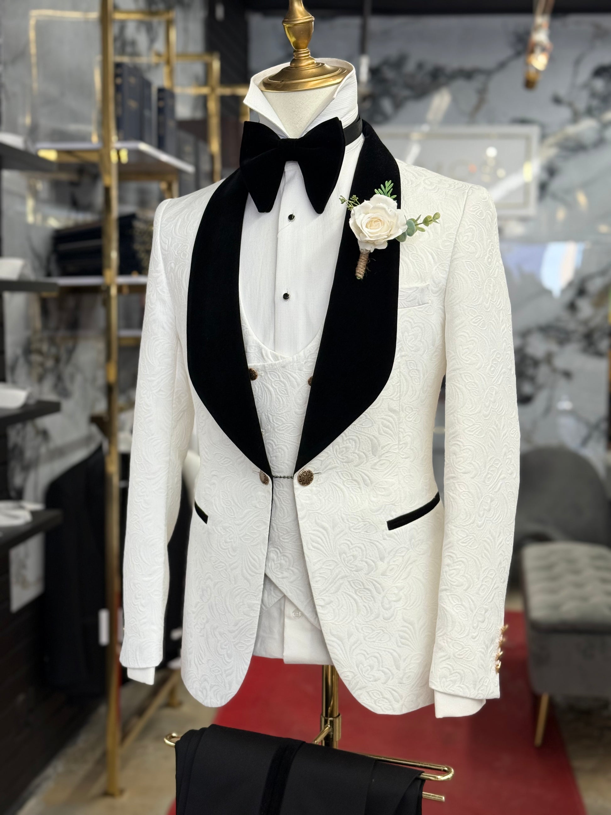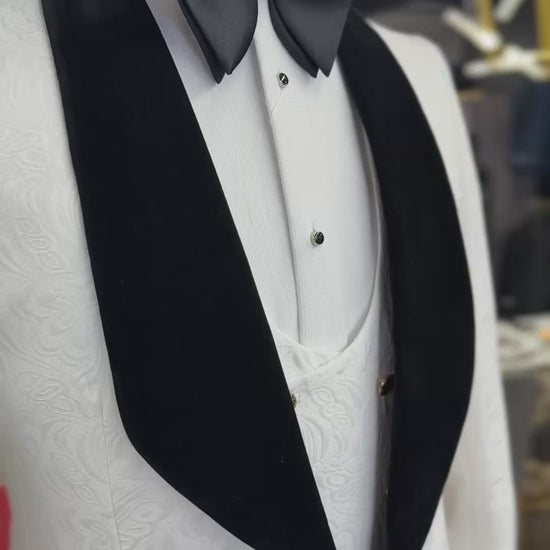 White Jacquard Jacket Black Velvet Shawl Lapel Tuxedo