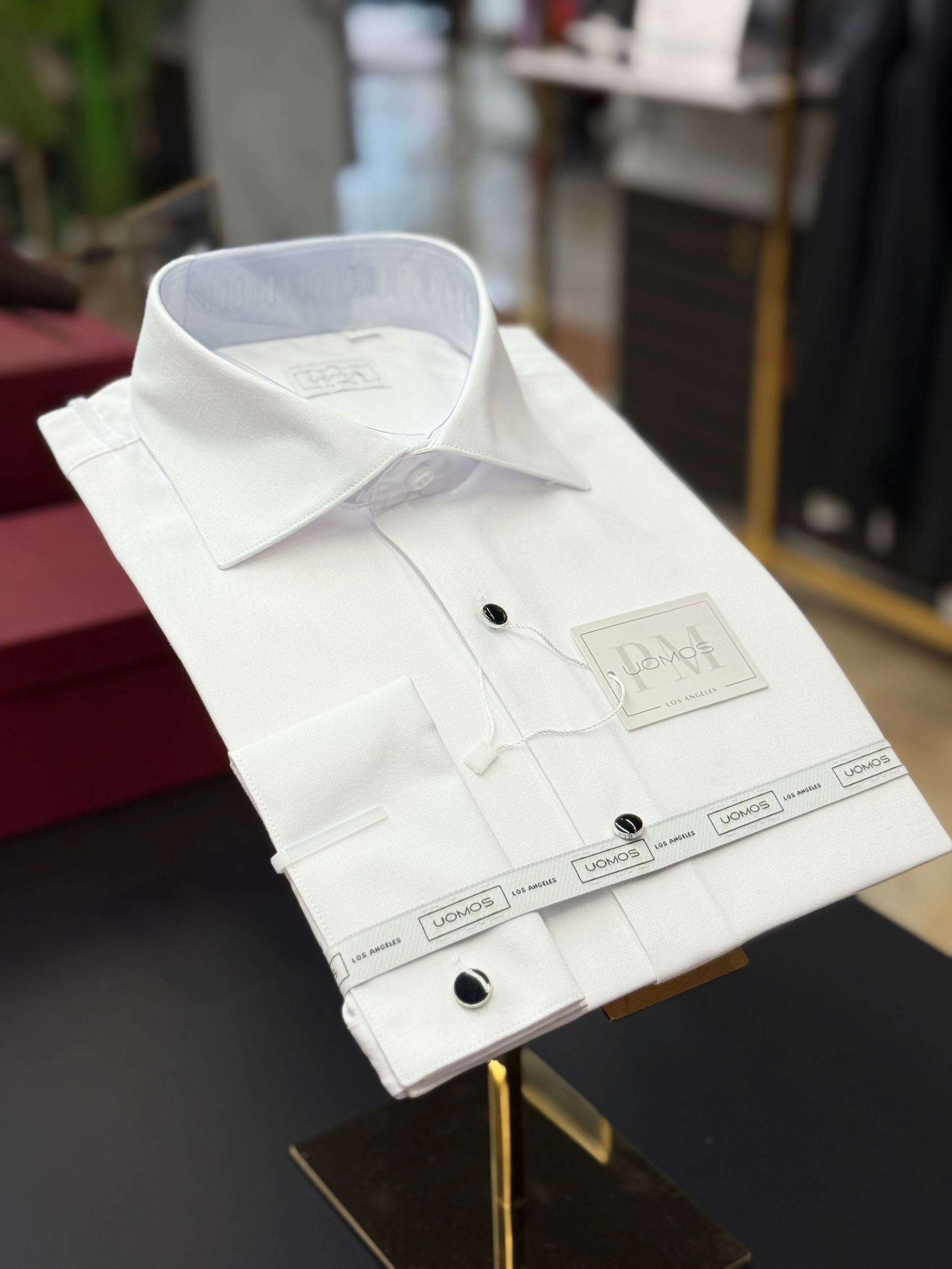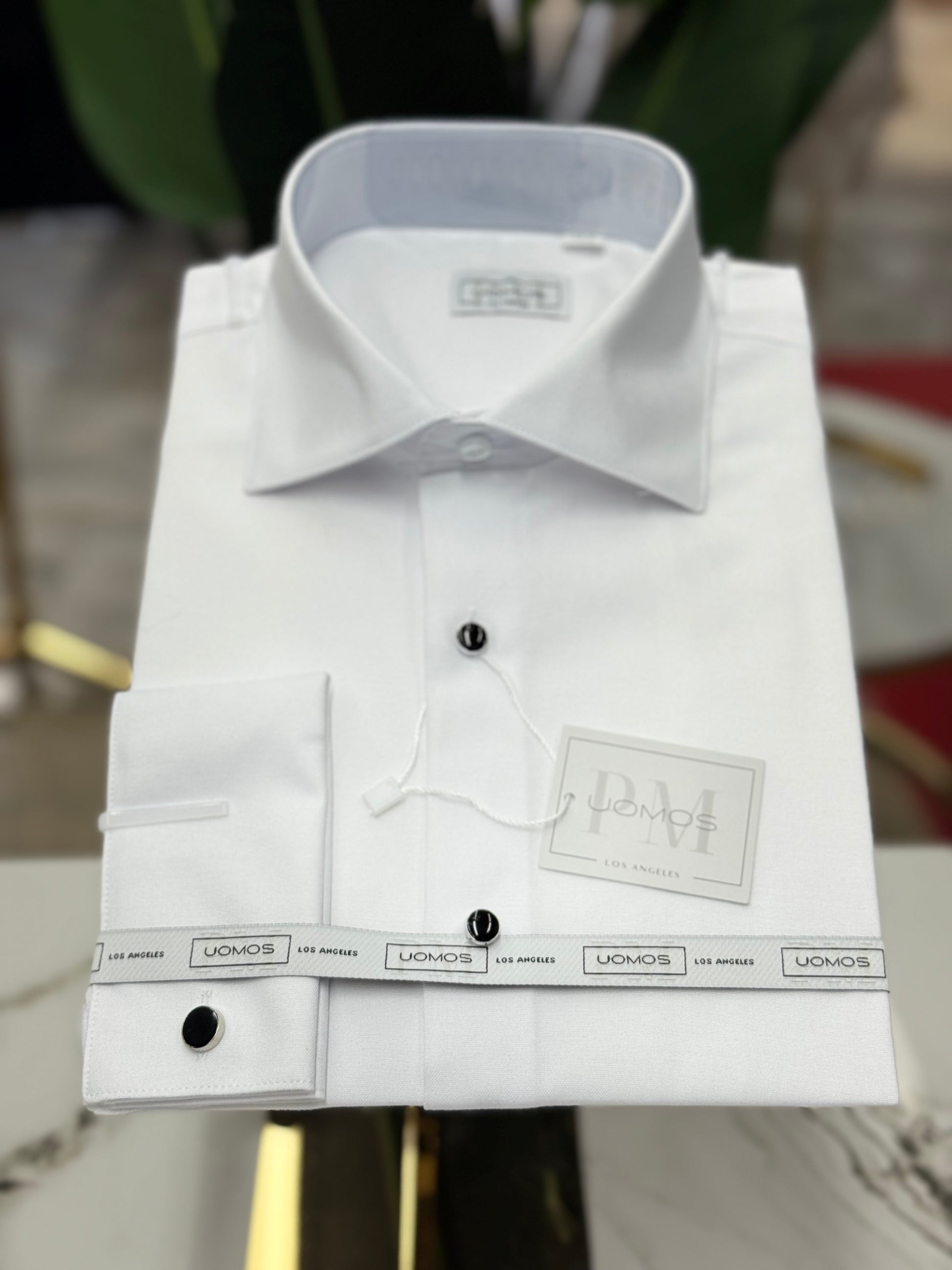 Tuxedo White shirt, tuxedo buttons, spread collar, french cuffs.